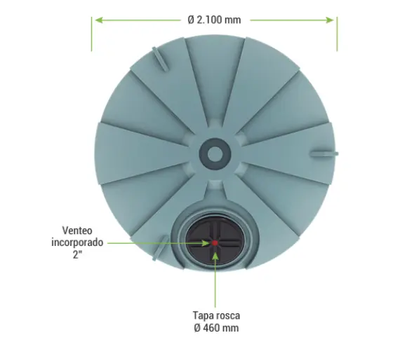 Cuenta con una salida HI de 2 pulgadas y un venteo incorporado de 2 pulgadas, lo que facilita la conexión a distintos sistemas de distribución o bombeo. Además, sus caras planas permiten montaje sencillo de accesorios, válvulas, filtros o sensores.