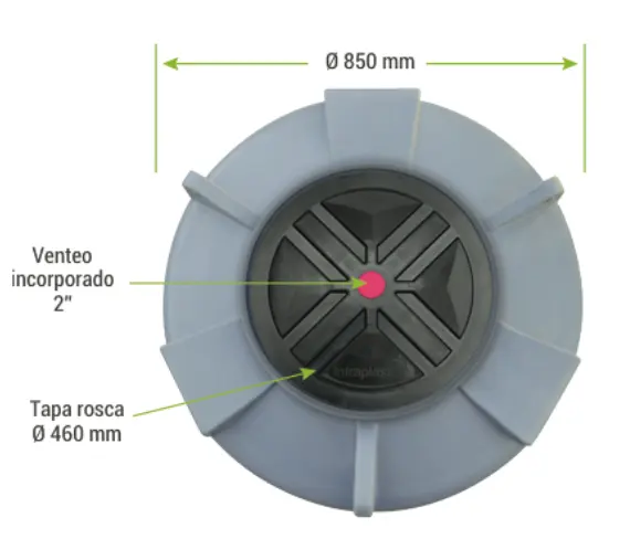 El estanque incluye ganchos de izaje para fácil manipulación, una cúpula superior reforzada con entre 4 y 8 caras planas, y una salida inferior HI de ¾” para conectar el venteo o accesorios de descarga con total seguridad y estanqueidad.