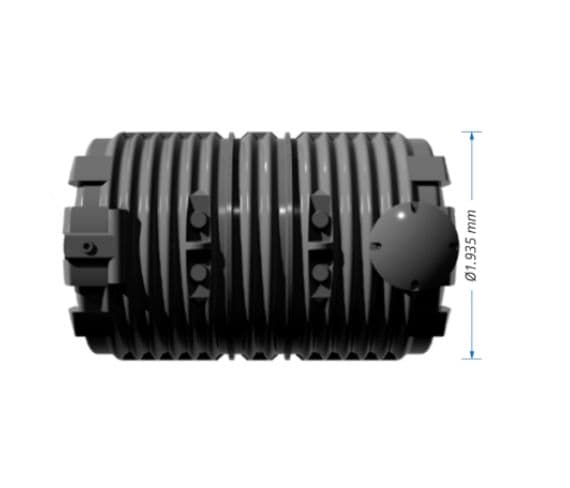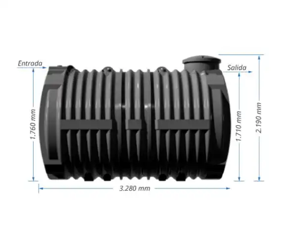 La fosa séptica tiene un ancho de 1935 mm, un largo de 3280 mm y una altura con tapa de 1080 mm.
