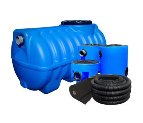 | Descripción | Fosa séptica con kit de instalación, ideal para viviendas rurales y pequeños negocios. Fabricada en polietileno LLDPE, diseño corrugado y horizontal, ligera y fácil de instalar. | Kit completo con fosa séptica de 1200 L, diseñada para evitar acumulación de gases. Incluye accesorios de drenaje para una instalación segura y eficaz. | Fosa séptica de 1200 L fabricada en polietileno LLDPE, con manto ondulado reforzado y escotilla de 600 mm. Incluye accesorios y es ideal para hasta 5 personas. |