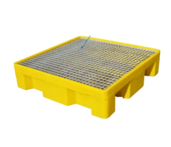 Este pallet cumple con todas las normativas de seguridad y calidad, por lo que es una opción confiable y segura para el manejo de sustancias peligrosas. Su color amarillo brillante también facilita su identificación y ubicación en caso de emergencias.