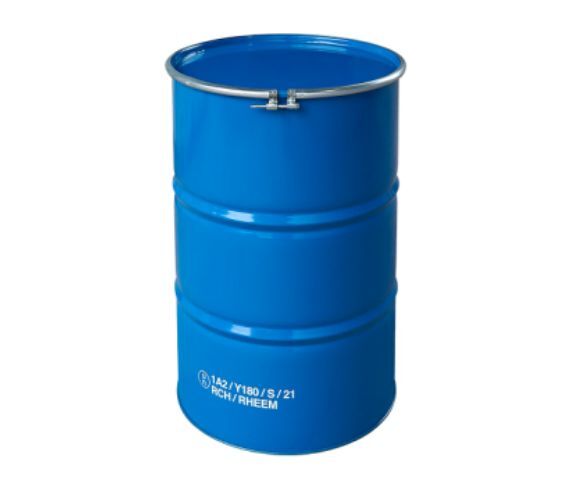 Con capacidad para 55 galones (208 litros), este envase metálico cilíndrico cuenta con dos rodones que facilitan su movilidad. Su diseño resistente y duradero garantiza la protección del contenido durante el transporte y almacenamiento.