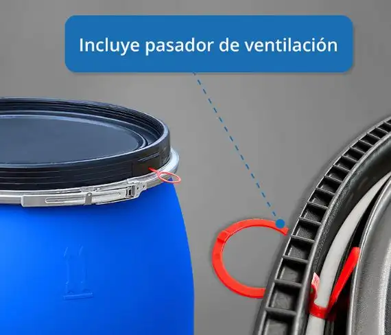 El Tambor Plástico de 220 Litros con Tapa Grande es una solución industrial de alta resistencia, fabricada en polietileno de alta densidad (PE-HD) y diseñada para el almacenamiento y transporte seguro de productos sólidos o de alta viscosidad. Su estructura robusta incluye una tapa desmontable con aro de acero galvanizado, junta de poliuretano (PU) y sistema de ventilación con pin de seguridad, lo que garantiza un cierre hermético y previene derrames incluso en condiciones exigentes.